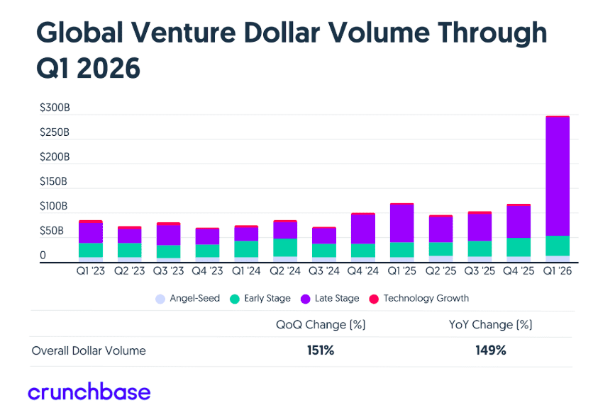 Global venture investment surged to a record of nearly $300 billion in the first quarter of 2026, fueled by “unprecedented” spending on AI compute and frontier labs, according to Crunchbase.
