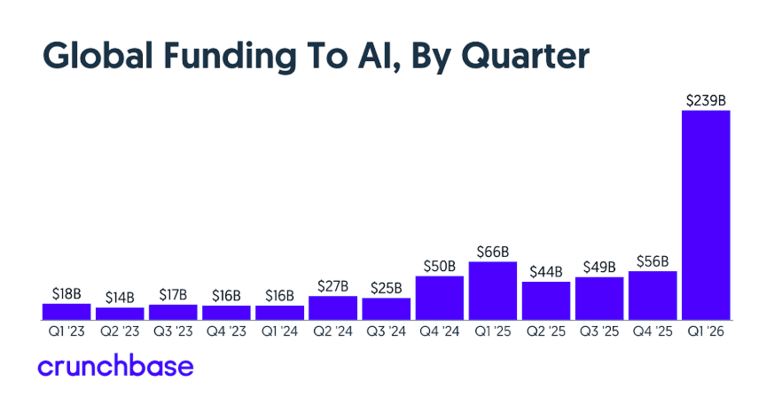Overall, AI companies captured $239 billion in funding in the quarter. That is a sharp increase from the previous record set in the first quarter of 2025, when AI accounted for 55% of funding.