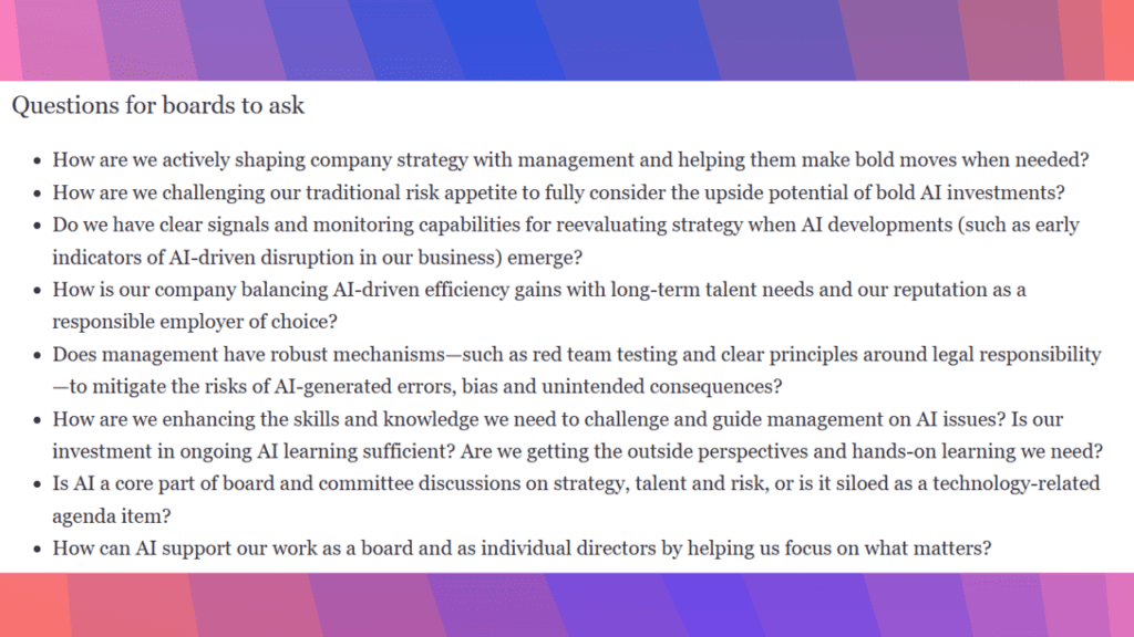 Historically, boards focused on monitoring management, but that model is changing. “With AI, there’s a shift from monitoring to shaping strategy” as the view shifts from siloed AI to AI embedded everywhere, Henderson said.
